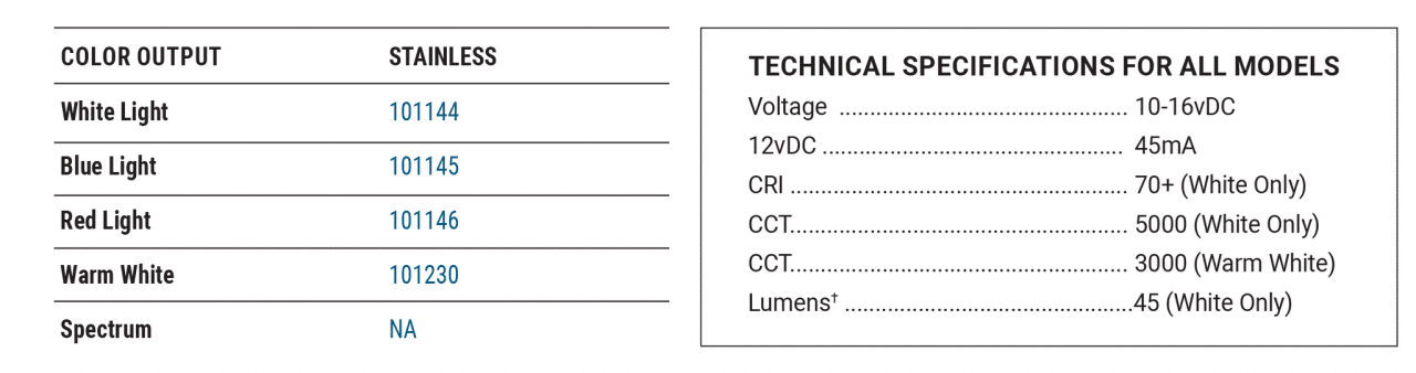 Small, attractive and discreet, Aruba lights offer a wide indirect beam and amazing performance. Measuring about 1” in diameter or less, Aruba is clean and easy to install. Fully water sealed and IP67 compliant, Aruba fits almost anywhere, perfect for step wells and compartments interior or exterior installations. Available in four color options with a polished stainless steel finish.